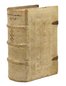 Ibid., 1556. 2 ouvrages en un volume in-8, peau de truie estampée sur ais de bois, bordure de portraits et d'angelots à froid, tranches lisses, fermoirs de laiton ouvragé (Reliure germanique de l'époque).Savante édition de l'Institution oratoire de Quintilien annotée par Joachim Camerarius, Johannes Sichard et d'autres.