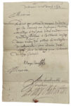 On joint une rare lettre autographe signée de Bussy-Rabutin sur le siège du château de Montrond, adressée à Monsieur de la Rifaudière, de Nevers ce 18e aoust 1652 (une page in-8 repliée, adressée et scellée) : Monsieur, L’advis que je viens de recevoir du dessein que les Ennemis ont de secourir Montron, m'oblige à vous prier de vous rendre vendredy prochain à La Charité, où j'ay donné rendez-vous à toute la noblesse de cette province pour adviser de ce qui sera de besoing pour le service du Roy. Je suis, Monsieur, votre tres humble serviteur.