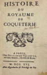 I. Histoire du royaume de coqueterie : réimpression extrêmement rare de l'Histoire du temps ou relation du royaume de Coqueterie, publiée pour la première fois en 1654. Le Catalogue collectif de France n'en recense aucun exemplaire.
