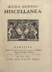 Le volume est orné d'un magnifique portrait de Ménage par Robert Nanteuil, dont c'est un des chefs-d'œuvre, de trois compositions à pleine page, d'une figure dans le texte de perroquet et de quelques vignettes et lettrines, le tout gravé au burin.