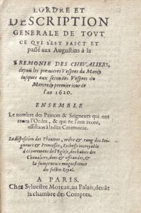 [ORDRE DU SAINT-ESPRIT] — L’Ordre et description generale de tout ce qui s’est faict et passé aux Augustins à la ceremonie des Chevaliers… l’an 1620.