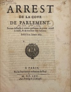 1. Arrest de la Cour de parlement, portant deffences à toutes personnes de porter armes la nuict, & de marcher sans lumière. Paris, Imprimeurs ordinaires du Roy, 1665. 4 pp. Arrêt du parlement de Paris du 28 novembre 1664, publié le 10 janvier 1665. Quelques rousseurs.