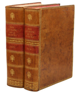 Madrid, Joaquin Ibarra, 1780. 4 tomes en 2 volumes in-4, basane marbrée, roulettes dorées, dos orné, pièces de titre et de tomaison rouges, tranches jonquille (Reliure de l'époque).Le Don Quichotte d'Ibarra : la plus luxueuse édition du roman de Cervantes et l'un des chefs-d'œuvre de l'imprimerie espagnole.