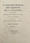 « Magnifique édition comme typographie et comme ornementation » selon Cohen, elle est ornée de deux titres-frontispices répétés, d'un portrait de Cervantes gravé par Carmona d'après José del Castillo, d'une carte dépliante et de 31 figures hors texte par Antonio Carnicero, José del Castillo, Bernardo Barranco, José Brunete et d'autres artistes.