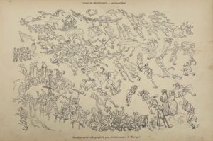 – Troisième rouleau. [I-VII]. 56 ff. Illustrations de Gustave Doré : Un atelier d'élèves peintres ; La vie en province ; suite ; suite et fin ; Une soirée ; Le galop infernal ; Toujours les collégiens ; Les gens qui posent dans le monde ; Au salon ; Promenade dans Paris ; Promenade au Tuileries ; Les grotesques ; Les eaux de Baden.
