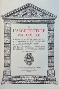 TALEMARIANUS (Petrus) — De l'architecture naturelle, ou rapport sur l'établissement, d'après les principes du tantrisme, du taoïsme, du pythagorisme et de la cabale, d'une règle d'or servant à la réalisation des lois de l'harmonie universelle et contribuant à l'accomplissement du Grand Œuvre.