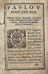 Ce volume rare et recherché est le premier livre imprimé avec les beaux caractères arabes de Savary de Brèves (1560-1628), ancien ambassadeur de France à Constantinople qui avait fondé à Rome une imprimerie dédiée aux langues orientales. Seuls deux ouvrages y furent publiés en arabe, en 1613 et 1614.