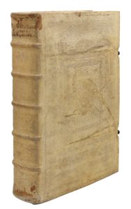 Anvers, Hendrik et Cornelis Verdussen, 1694. 3 tomes en un volume in-folio, peau de truie sur ais de bois, multiples encadrements de frises de rinceaux et médaillon central estampés à froid, tranches vertes, fermoirs de peau et laiton (Reliure germanique de l'époque).Nouvelle édition de l'important commentaire de l'Ecclésiaste, du Cantique des cantiques et du Livre de la Sagesse publié dès 1638 par le jésuite belge Cornelis van den Steen (1567-1637), dit en latin Cornelius a Lapide.