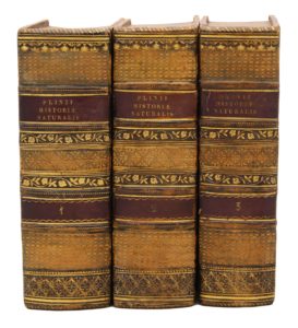 Leyde et Rotterdam, Officina Hackiana, 1668-1669. 3 volumes in-8, basane jaspée, roulette et losange central à froid, dos de veau brun richement orné de motifs dorés et à froid, tranches jaspées (Reliure du début du XIXe siècle).Savante édition commentée de l'Histoire naturelle ornée de trois frontispices gravés par G. Wingendorp.