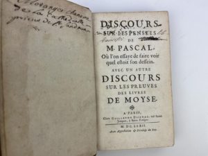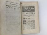 Pascal Blaise Discours sur les pensées de M. Pascal, ou l'on essaye de faire voir quel estoit son dessein. Avec un autre discours sur les preuves des livres de Moyse. Paris, Guillaume Desprez, 1672. 1 volume in-12, reliure d'époque en plein veau marron, dos à nerfs avec fleurons dorés, titre doré. Mors faible, coiffe arasée.