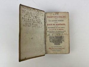 Pascal Blaise Les provinciales ou lettres écrites par Louis de Montalte a un provincial de ses amis. Cologne, Chez Nicols Schoute, 1685. 1 volume in-12, reliure d'époque en plein vélin à recouvrement ivoire, coutures apparentes, pièce de titre en papier moderne effacé, manque de cuir en pied et sur un coin. 12 ff.n.c.- 432 pp. Exemplaire modeste.