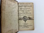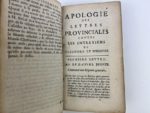 Pascal Blaise Réponse aux lettres provinciales de L. Montalte, ou entretiens de Cléandre et d'Eudoxe. Bruxelles, chez Eugène Henry Fricx, 1697. 1 volume in-12, reliure d'époque en plein veau, dos à nerfs ornés de fleurons dorés, pièce de titre en basane marron. 404 pp. Petits défauts. Exemplaire correct. On joint : apologie des lettres provinciales de Louis de Montalte contre la dernière réponse des jésuites intitulée, entretiens de Cléandre et d'Eudoxe. Rouen, chez Henri Van Rhin, 1698. 1 volume in-12, reliure d'époque, dos à nerfs avec décors dorés dans les caissons, manque la pièce de titre. 1 mors fendu sur 4 cm, exemplaire modeste VIII pp. - 160 pp. Soit 2 volumes