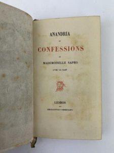 Anonyme Anandria ou confessions de mademoiselle Sapho avec la clef. Lesbos, S.E., 1866. 1 volume …