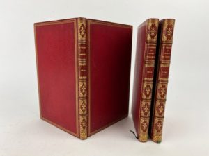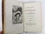 Delvau Alfred - Nerval Gérard - Staal Gustave Gérard de Nerval, sa vie et ses œuvres. Paris, librairie de Mme Bachelin-Deflorenne, 1865. 1 volume in-12, reliure d'époque en plein maroquin rouge, dos à nerfs orné de fleurons et filets dorés ; auteur, titre et date dorés, triple filet doré sur les plats, guirlande dorée sur les contreplats, toutes tranches dorées (rel. Niedré). Portrait par Staal. On joint 2 volumes dans une reliure identique : Lamenais sa vie intime à la Chênais, portrait par Staal et Elisa Mercoeur par Jules Clarétie, portrait par Staal. Quelques rousseurs uniquement sur les 3 portraits. Beaux exemplaires parfaitement établis en plein maroquin.
