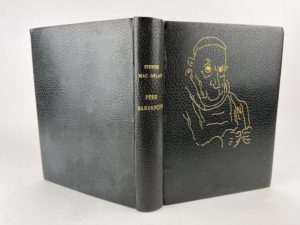 Mac-Orlan Pierre - Bofa Gus Père Barbançon. Paris, éditions Arc-en-ciel, 1948. 1 volume in-4°, reliure d'époque en plein maroquin noir, dos lisse avec auteur et titre, premier plat décoré d'un dessin en filet doré d'après Gus Bofa, reprenant la gravure en regard de la page 116 représentant le portrait du père Barbançon. Tête dorée (rel. F. Badoit, Lyon). Bel exemplaire sans rousseur, couverture conservée, ouvrage tiré à 500 ex., celui-ci port le n° 304, imprimé sur pur fil Johannot. Illustrations en noir réalisées par le grand Gus Bofa.