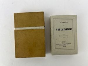 La Fontaine (Jean de) Fables, édition miniature. Paris, fonderie typographique, 1850. 1 volume broché in-32 (7 x 5 cm) non coupé, sans rousseur et toujours protégé par son étui d'époque de couleur crème. Remarquable prouesse typographie, bel exemplaire.