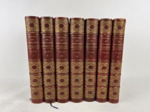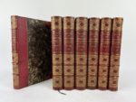 Montaigne (Michel de) - Malherbe (François de) Œuvres. Collection des classiques françois. Paris, Didot et Lefèvre 1826. 5 volumes grand in-8°, reliure signée Capé. Demi-maroquin à coins, dos à nerfs très ornés de motifs dorés à petits fers perlés, titres et tomaisons dorés têtes dorées. Exemplaire non rogné, quelques légers défauts et frottements d'usage. Impression sur vélin fort à toutes marges, papier très blanc, très peu de piqures sur l'ensemble des cahiers de texte. Série truffée et enrichie de nombreuses gravures venant d’autres éditions, documents, portraits, suites d'illustrations avant la lettre, etc. Certaines gravures ajoutées sont parfois roussies. Une table manuscrite au crayon indique les documents ajoutés. On joint deux volumes de François de Malherbe, de la même collection, dans la même reliure. Série complète, élégante et bien établie, remarquable impression de Jules Didot, imprimeur du roi. Soit 7 volumes
