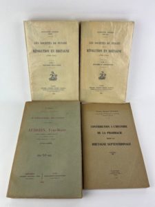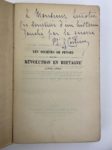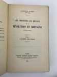 Cochin Augustin Les sociétés de pensée et la révolution en Bretagne (1788-1789). Paris, chez Honoré Champion, 1925. 2 volumes brochés in-8° en partie non coupés. Bon état. Envoi d'un membre de la famille de l'auteur à Mr Lenôtre « en souvenir d'un historien fauché par la guerre ». On joint Pierre Hémon : la révolution en Bretagne, notes et documents, Audrein, Yves-Marie 1741- 1800. Paris chez Honoré Champion et Saint-Brieuc chez Guyon, 1903. 1 volume broché in-8° non coupé. Bon état. Et on joint une curiosité : contribution à l'histoire de la pharmacie dans la Bretagne septentrionale de Bernard Lemarié. Rennes chez Riou-Reuzé, 1946. 1 volume in-8° broché en bon état, piqûres sur la tranche. Envoi de l'auteur. Soit 4 volumes brochés.