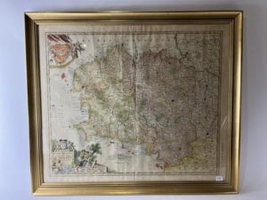 Homann Jean-Baptiste Tabula Ducatus Britanniae Gallis. Le Gouvernement général de Bretagne. Nuremberg, J.-B. Homanno, S.D (circa 1715, indiqué au crayon dans la marge). Belle carte de Bretagne coloriée, plan de la ville de Brest en haut à gauche, cartouche et titre en bas à gauche - 52x60 cm Bon état. Encadrement moderne en bois doré. Carte extraite d'un atlas, ancienne trace de pli au centre.
