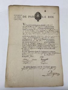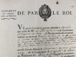 Placard XVIIIème (36 x 24 cm) en partie imprimé et complété à la plume, condamnant à mort le 20 juin 1757 par contumace pour faits de désertion avérés, Jacques Le Roy, natif de la paroisse de Langourla évêché de Saint-Brieuc. Suivent toutes les signatures en bas de page. Document historique en bon état.