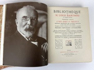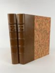 Barthou Louis Bibliothèque de M. Louis Barthou, de l'académie française. Paris, Auguste Blaizot, & fils, 1935. 2 volumes in-4°, reliure moderne en demi-veau marron, dos à nerfs avec titre et tomaison dorés. Très bon état, dos légèrement insolés. Couvertures conservées. Les deux premières parties sur quatre. Plus de 1100 fiches pour le plaisir de lire les noms des plus grands relieurs, illustrateurs et auteurs bien-sûr.