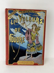 Ivoi (Paul d') Voyages excentriques, les voleurs de foudre. Paris, ancienne librairie Furne, S.D. (1912). 1 volume petit in-folio, cartonnage éditeur en pleine percaline rouge, plaque polychrome sur le premier plat, plats biseautés, dos lisse avec auteur et titre dorés et un personnage polychrome, toutes tranches dorées. Ouvrage illustré en noir par Louis Bombled. Dos légèrement insolé et 2 ou 3 frottements d'usage, petites rayures sur le premier plat. Le volume est en bel état, sans rousseur, pas de feuillet déboîté. Superbe plat historié, dans les plus spectaculaires de cette période.