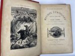 Verne Jules Cinq semaines en ballon. Paris, Hetzel, S.D. (circa 1890). 1 volume in-8°, cartonnage éditeur en percaline rouge aux feuilles d'acanthe polychrome, reliure Magnier et ses fils. Exemplaire correct, légers frottements d'usage, rousseurs éparses, dos un peu passé, second plat possiblement reteint. On joint Michel Strogoff, 1 volume grand in-8°, cartonnage éditeur à un éléphant, titre dans l'éventail, dos au phare. (Engel rel). S.D. (circa 1900) ; exemplaire modeste, corps d'ouvrage en partie dérelié.
