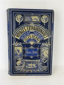 Verne Jules La maison à vapeur. Paris, Hetzel, S.D. (1880), catalogue AI. 1 volume grand in-8°, cartonnage éditeur en percaline bleue aux deux éléphants. Plaque de Souze, A.Lenègre relieur. Gardes bleues. Frottements d'usage, dos assombri, rousseurs éparses, ors du premier plat corrects avec des petits manques, coiffe supérieure défraîchie, en pied ; la coiffe a été changée. Coutures un peu lâches mais corps d'ouvrage toujours solidaire à la reliure. Exemplaire modeste dans une couleur peu courante.