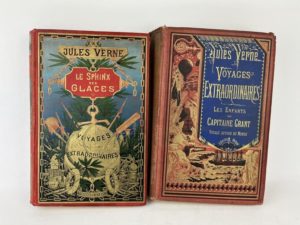 Verne Jules Les enfants du capitaine Grant. Paris, Hetzel, S.D. (1895) catalogue HF. 1 volume grand in-8°, cartonnage éditeur à la bannière bleue, plaque signée Souze. Exemplaire modeste, frottements d'usage en particulier sur les coins, dont un abîmé ; dos passé, premier plat poussiéreux et ors un peu passés, rousseurs éparses. On joint Le sphinx des glaces, cartonnage au globe doré, dos au phare (circa 1897) exemplaire en partie recollé et reteint. Soit 2 volumes grand in-8°.