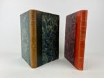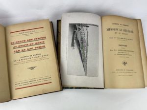 Courtot Montchamp - Lagrillière-Beauclerc Du golfe des Syrtes au golfe du Bénin par le lac Tchad. Journal de marche de mission Tunis-Tchad. Tunis, Maison française d'éditions Albert Guénard, 1926. 1 volume in-8°, reliure d'époque en demi-basane rouge, dos à nerfs avec auteur et titre dorés, couverture conservée. Frottements d'usage. Reproductions de photo en noir et blanc, envoi du lieutenant-colonel Courtot au capitaine Duprez. On joint 1 volume intitulé : Mission au Sénégal et au Soudan, voyage de M. André Lebon, ministre des colonies (octobre-novembre 1897). Paris, Tallandier, S.D. (circa 1900). Reliure en demi-basane verte, dos lisse avec auteur, titre, fleurons et filets dorés. Dos insolé.