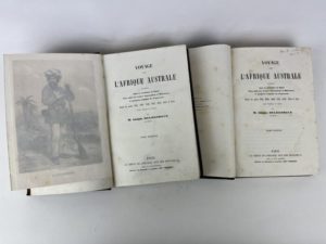 Delegorgue Adulphe Voyage dans l'Afrique australe, notamment dans le territoire de Natal, dans celui des Cafres Amazoulous et Makatisses et jusqu'au Tropique du capricorne. De 1838 à 1844. Paris, au dépôt de librairie, rue des moulins, S.D. (circa 1847). 2 volumes in-8°, reliure d'époque en demi-chagrin marron, dos à nerfs avec auteur, titre et tomaisons dorés. Belle restauration des plats avec le remplacement de la percaline par une nouvelle, de couleur marron. Rousseurs éparses. Exemplaire complet des 2 cartes dépliantes et des 8 planches hors-texte. Vocabulaire zoulou et catalogue des insectes en fin du tome 2. Adulphe Delegorgue rapporta de ses voyages une importante documentation et des informations sur la nature entre le 30e et le 23e parallèles sud mais également sur la vie des populations autochtones. Grand chasseur il fut surnommé, le tueur d'éléphants.