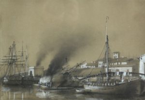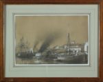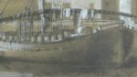 Antoine FREMY (1816-1885) Scène portuaire - la calfatage. Dessin à la mine de plomb réhaussé de gouache blanche. Signé en bas à droite. 22,5 x 33 cm. Encadrement sous verre 37 x 47 cm.