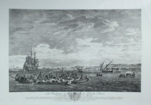 Gravure "La Madrague ou la pêche du thon - Vue du golphe de Bandol", d'après le tableau original de Joseph Vernet (1714 -1789) appartenant au Roy (Louis XV) et faisant partie de la collection des ports de France ordonné par M. Le Marquis de Marigny. Planche gravée, circa 1760, à l'eau-forte et au burin. Graveur Charles-Nicolas Cochin (1715-1790) et Jacques-Philippe Le Bas (1707-1783) pour certaines gravures de la série. Support primaire : 68 x 91,5 cm. Hors marge 52 x 74 cm. Restauration par bain de trempage.
