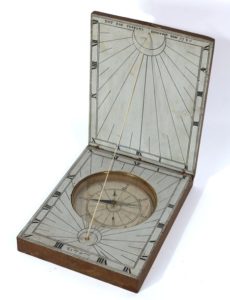 Cadran solaire diptyque en bois de grandes dimensions. Cerclage de la boussole en laiton, rose des vents à l'encre et à la plume. Marquage des heures en chiffres romains. Arqué : "Fait par François l'an 1786" et la latitude de l'endroit pour laquelle ce cadran a été réalisé " 48 deg, 41 min." . 21,5 x 16 cm. France fin XVIII éme.