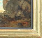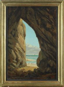 Ecole du XIX ème. De la grotte, la mer à marée basse. Huile sur toile. Monogrammée "JB" en bas à droite. 32x 21,5 cm. Cadre, baguette dorée. 37 x 27 cm.