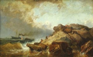 Ecole du XIX ème. Scène de naufrage. Les rescapés se réfugient à la côte. En mer, leur …