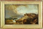 Ecole du XIX ème. Scène de naufrage. Les rescapés se réfugient à la côte. En mer, leur bateau est en train de sombrer. Huile sur toile. 20 x 34 cm. Cadre bois et stuc doré. 29,5 x 43 cm.