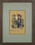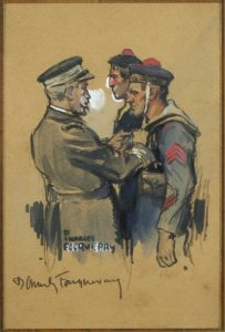 Charles FOUQUERAY (1872-1956). La remise de médaille aux marins. Gouache. Signé et contre-signée en bas à gauche. 19 x 12,5 cm. Encadrement 36,5 x 29 cm.