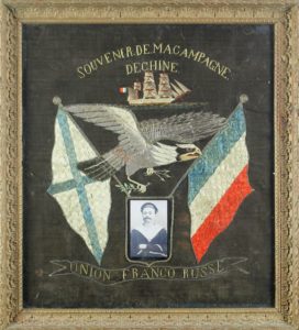 Souvenir de campagne. Tableau de soie brodée de "Souvenir de ma campagne de Chine - Union Franco-Russe". La photo d'un marin est surmontée, au centre, de l'aigle emblème de la Russie, ici monocéphale, avec dans ses serres : un rameau d'olivier et des flèches. Les drapeaux français et russe sont de part et d'autre de la photo. Le bâtiment sur lequel est enrôlé le marin est représenté toutes voiles dehors, il bat pavillon français. 44 x 38,5 cm. Très légères Insolations et usures. Circa 1901. Encadrement sous verre en bois et stuc doré. 51 x 46 cm. Note 1 : En Chine, en 1900, le soulèvement nationaliste des Boxers s’étend à plusieurs provinces et entre dans une phase de conflit armé avec les délégations étrangères présentes sur place. Les puissances occidentales dont le Japon, la France et la Russie s’allient dans une grande coalition internationale, , qui dépêchent des troupes . Cette alliance dite « Alliance des huit nations » est officiellement destinée à épauler le gouvernement impérial chinois. La guerre des Boxers s’achève le 7 septembre 1901 par la signature d'un traité de paix. Note 2 : Ces tableaux de soie, étaient fabriqués, en grand nombre sur le même modèle, par des manufactures chinoises, ou indochinoises. Les marins en escale les achetaient dans les comptoirs et les rapportaient de leurs escales asiatiques. Afin de pouvoir personnaliser ces souvenirs de campagne, il était souvent ménagé une fenêtre au regard de laquelle le marin pouvait y accoler sa photo en uniforme ou celle du bâtiment sur lequel il était embarqué.
