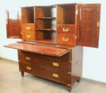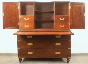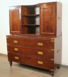 Commode de marine deux corps en acajou de cuba massif avec intérieur des tiroirs en chêne. Composée de trois tiroirs en partie basse et, en partie haute, de deux volets encadrant une niche centrale ouverte à trois niveaux. Chacun des volets découvrant une niche et deux tiroirs. Poignées en laiton encastrées et battantes sur les tiroirs, et poignées de transport battantes. Serrures à crochet avec ses clefs pour la partie haute. Angleterre fin XIX début XX éme. Hauteur 143 cm, façade 119 cm. Manque une poignée battante sur coffre bas. Note : Très certainement une commode ayant meublé et décoré la salle à manger d'un grand yacht.