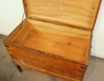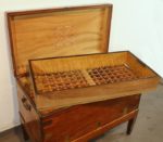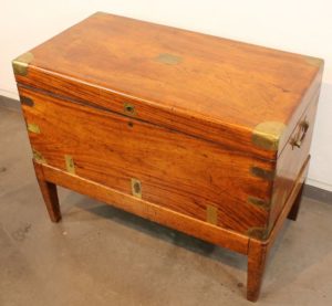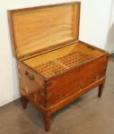 Coffre en camphrier. Poignées latérales de transport en laiton. Renforts des angles et coins en laiton. Fermoir à loquet battant. Plaque de propriétaire en laiton gravé "Mme Paul Vavin". Plateau intérieur en cannage ajouré sur une structure plaquée de "bois citron". Fin XIX éme / Début XX éme. Le coffre est présenté et fixé sur un support rapporté à quatre pieds d'époque postérieure.