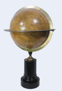 Charles DIEN (1809-1870). Globe terrestre - cartouche sur le globe : « Globe Terrestre publié par CH. DIEN A Paris 1831». Table équatoriale et cercle méridien en métal. Ensemble sur un pied en bois noirci. Hauteur : 60 cm - Diamètre : 30 cm. Marques du temps, restaurations. Belle patine. Note : Charles Dien Père travaillait en tant que graveur pour la famille Delamarche aux environs de 1819. Son fils, Charles Dien astronome et cosmographe, fut l’auteur de plusieurs planétariums, globes terrestres et célestes. Il publia plusieurs atlas sur les phénomènes astronomiques et en 1833 une Description et usage du globe céleste (Dictionnaire des fabricants français d’instruments de mesure du XVe au XIXe siècle)