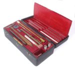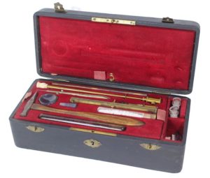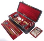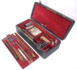Coffret de minéralogiste en bois gainé noir ouvrant par un couvercle, formant rangement à éprouvettes, sur deux étages compartimentés renfermant nombre d'instruments et équipements. L'intérieur est tapissé de tissu rouge. Epoque Napoléon III. 31 x 13 x 10 cm.