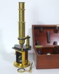 Maison de l'INGENIEUR CHEVALLIER - Paris - MICROSCOPE à tambour en laiton dans son coffret d'origine en acajou, complet de ses accessoires et de ses oculaires de grossissements différents. Longueur du coffret : 32 cm. Deuxième moitié XIX éme. Il est joint la reproduction de la notice d'utilisation.