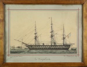 Ecole française. "Le Napoléon" dans le bandeau inférieur Portrait du navire de ligne de la marine française. Dessin à la plume et rehaut à l'aquarelle. Intitulé, signé et daté "H. Maubert - 1872". Envoi "Offert à ma soeur". 43 x 68,5 cm. Encadrement baguette bois verni sous verre. 62 x 87 cm. Note : Napoléon armé de 90 canons, fut construit en 1848. Il fut le premier navire de guerre au monde à disposer de la propulsion à hélice.