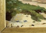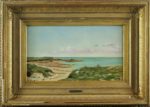 Gustave Edouard LE SENECHAL DE KERDREORET (1840-1920) Plage bretonne. Huile sur toile signée en bas à gauche. 24,5 x 43,5 cm. Cadre bois et stuc doré. Cartel en laiton "Le Sénéchal". 48,5 x 67,5 cm.