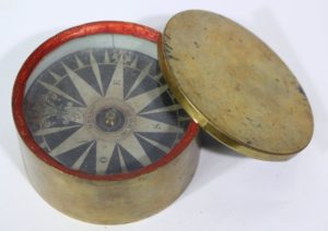 Compas de doris. Cuve sèche et couvercle en laiton. Rose des vents marqué "DEVOT AU HAVRE". …