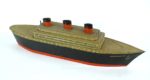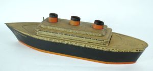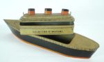 Boite à gâteaux, des galettes Saint Michel. En tôle lithographiée, elle est à la forme du paquebot Normandie. Dans la coque se trouve la boîte proprement dite qui peut être extraite de celle-ci. Complet de ses trois cheminées. Longueur 57 cm. Manque le drapeau à la poupe. Marques du temps dont traces de rouille.