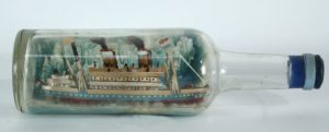 Bateau en bouteille. Paquebot deux cheminées aux couleurs des Pays Bas. Longueur 29 cm.