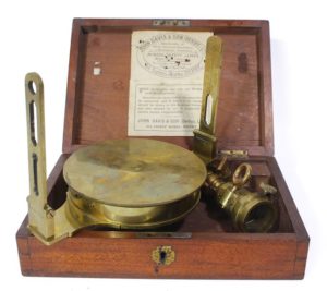 Cadran de visée à alidades à l'usage des mineurs. Diamètre 14 cm. Dans sa boite en acajou. Etiquette " JOHN DAVIS & SON". Angleterre fin XIXème.
